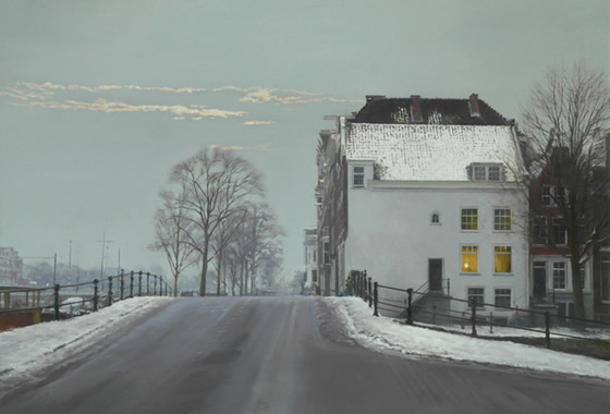 Titel: Avond, huizen aan de gracht