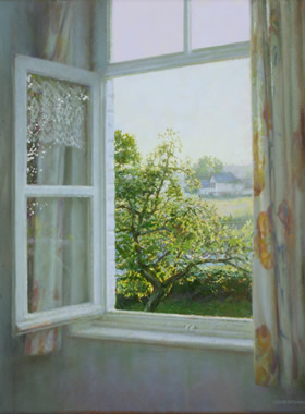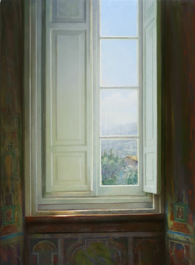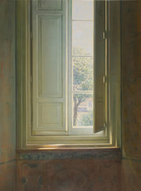 Titel: Open staand raam Afmetingen: 55x57cm Techniek: Olieverf op paneel