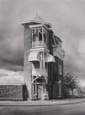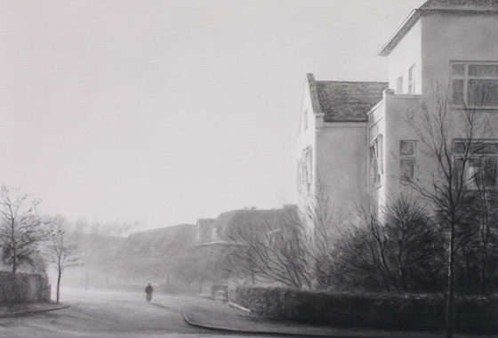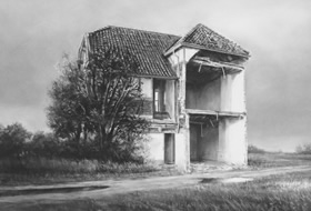 Titel: Hoekhuis Afmetingen: 38x40cm Techniek: Krijttekening