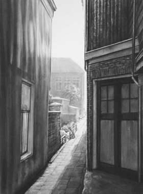 Titel: Steeg Zaandam Afmetingen: 35x51cm Techniek: Krijttekening