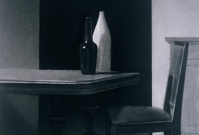 Titel: Stilleven met flessen Afmetingen: 38x38cm Techniek: Krijttekening
